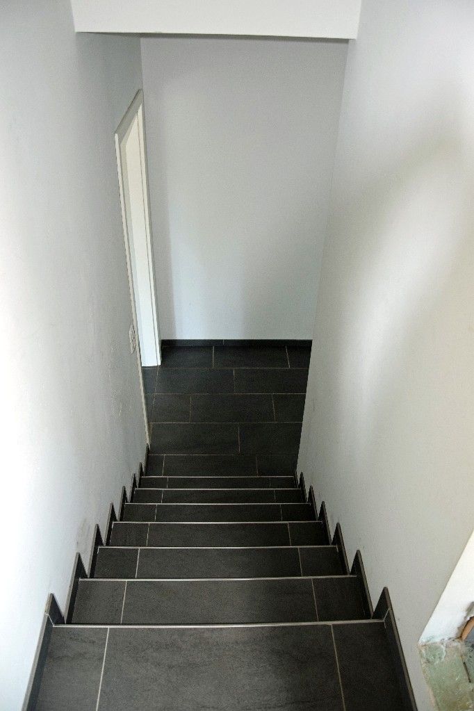 Eine Geschosstreppe aus Beton, gefliest, führt ins