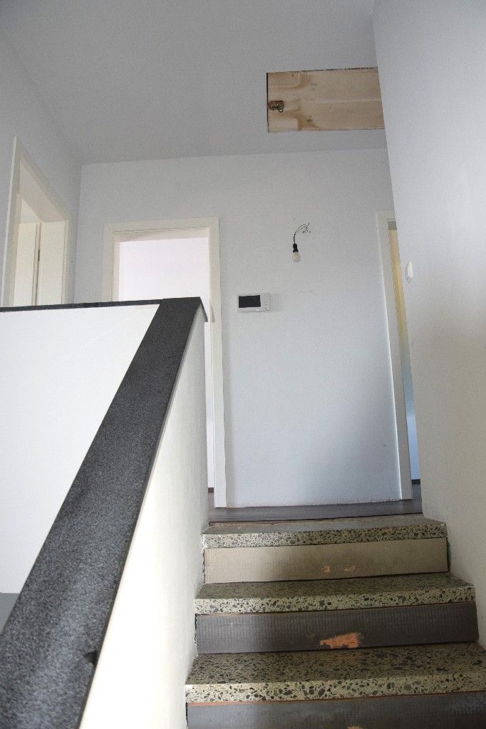 Vom Flur aus führt eine Einschubtreppe auf den Speicher. Dieser dient als Abstellfläche.