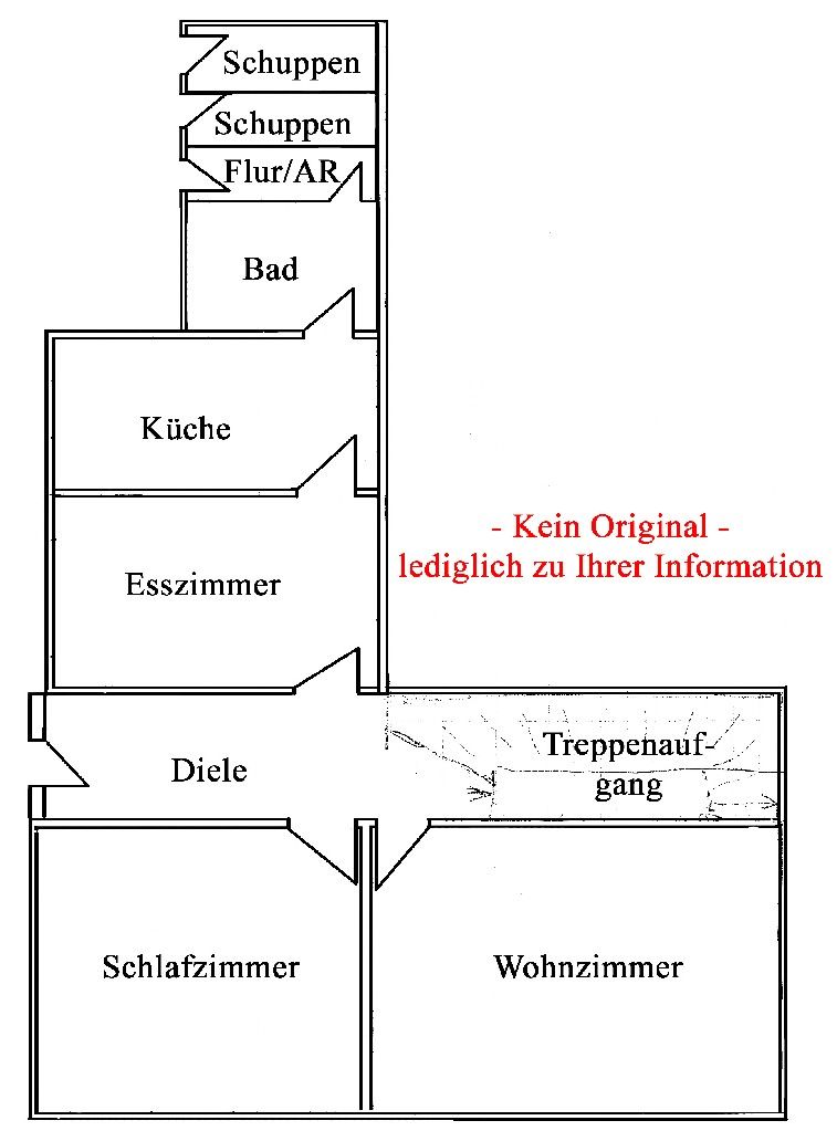 Hinweis: Das Wohnhaus wurde zuletzt als Zweiparteienhaus (Erdgeschoss und Obergeschoss) genutzt. Die Erdgeschosswohnung ist nicht in sich abgeschlossen, sodass ein gemeinsamer Eingangsbereich (Diele) besteht.