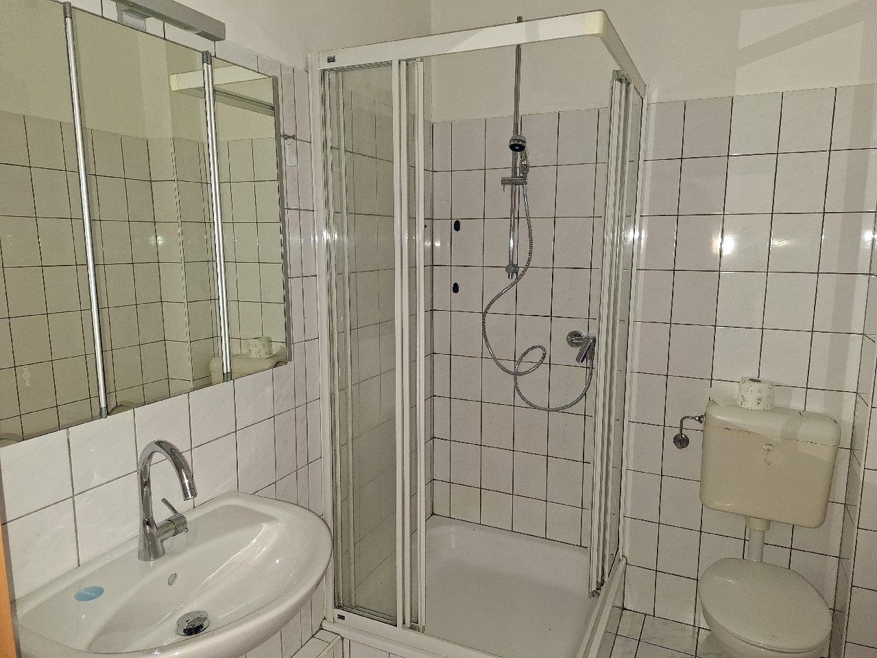 - Bad mit Dusche, Handwaschbecken und WC