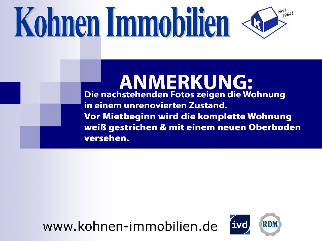 Die Wohnung wird bei Mietbeginn renoviert (weiß gestrichen, neuer Bodenbelag) übergeben.
