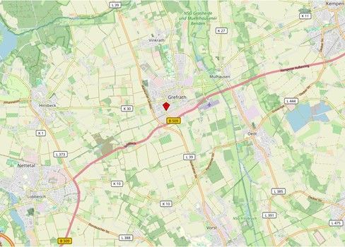 An einer Ortsausgangsstraße in zentrumsnaher und verkehrsgünstiger Wohnlage von 47929 Grefrath. Die Läden des täglichen Bedarfs sowie Ärzte und Apotheken etc. erreichen Sie fußläufig. Grefrath verfügt über verschiedene Freizeit- und Erholungsmöglichkeiten, so z.B. über ein Eisstadion oder Freibad. Durch die nahe gelegenen Autobahnen A61 Richtung Venlo (NL) bzw. Mönchengladbach/Düsseldorf/Köln und A40 Richtung Venlo (NL) bzw. Ruhrgebiet haben Sie optimale Verkehrsanbindungen. Die B509 führt Sie direkt in den Krefelder Raum. Nicht unerwähnt bleiben sollten die internationalen Zugverbindungen ab Bahnhof Kempen.