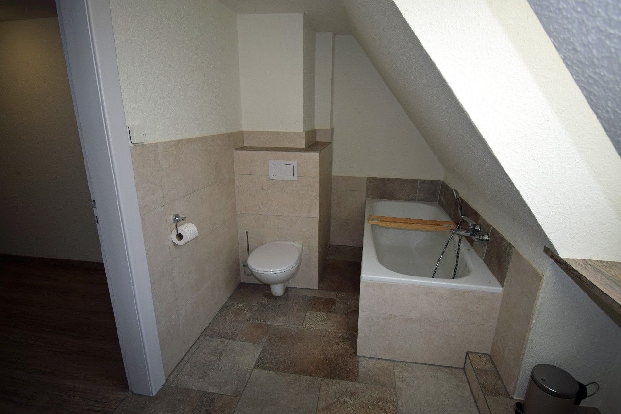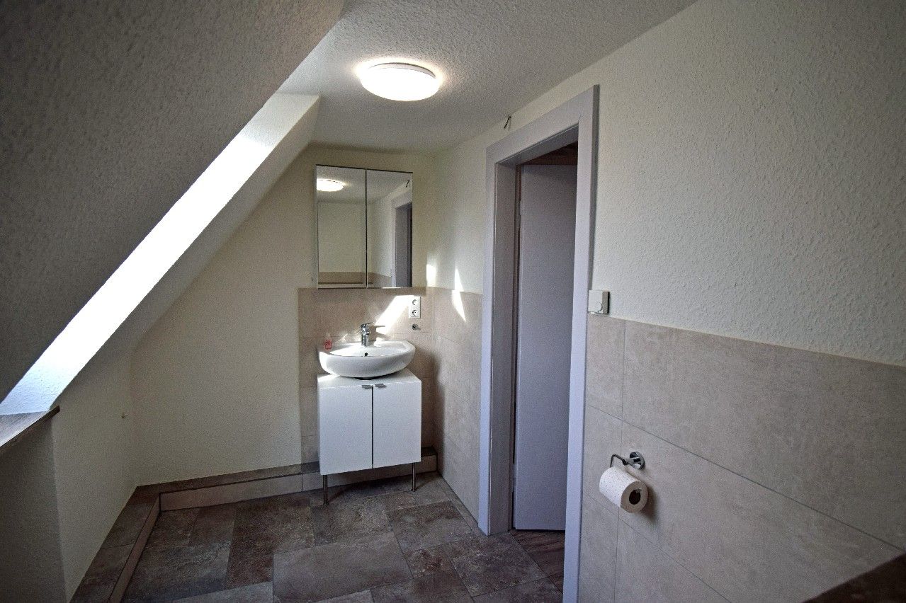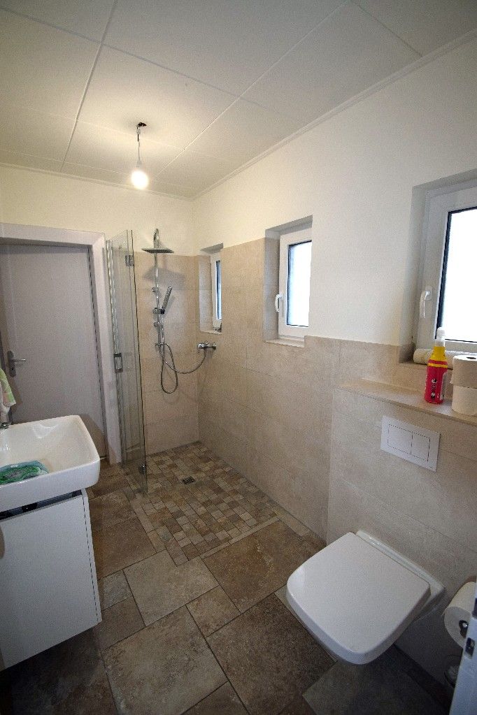 - Bad mit Handwaschbecken, WC und ebenerdiger Dusche