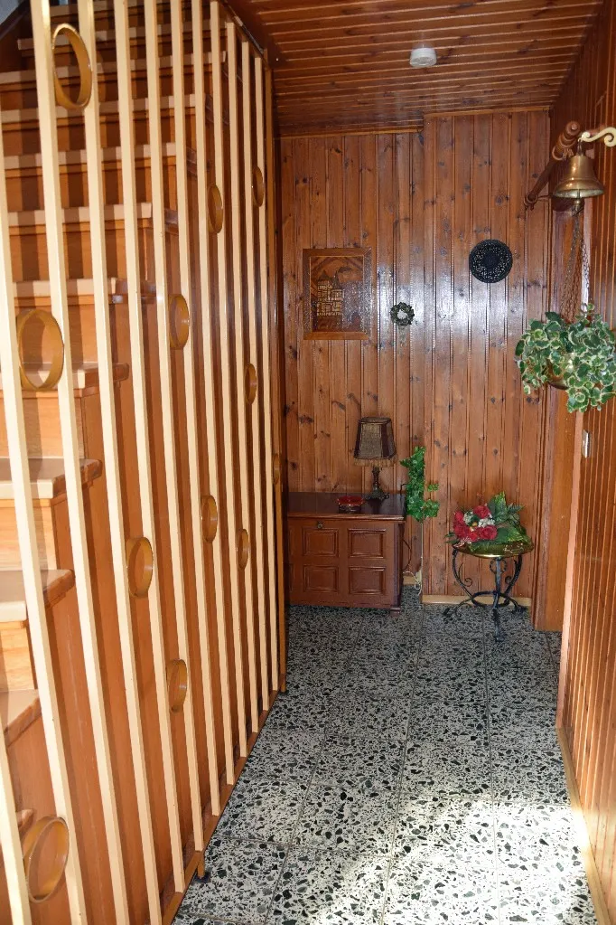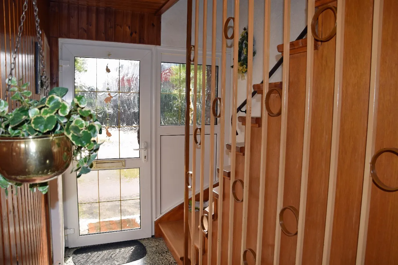 Die Geschosstreppe aus Holz führt in den Flur im Erdgeschoss. Von da aus gelangen Sie in die