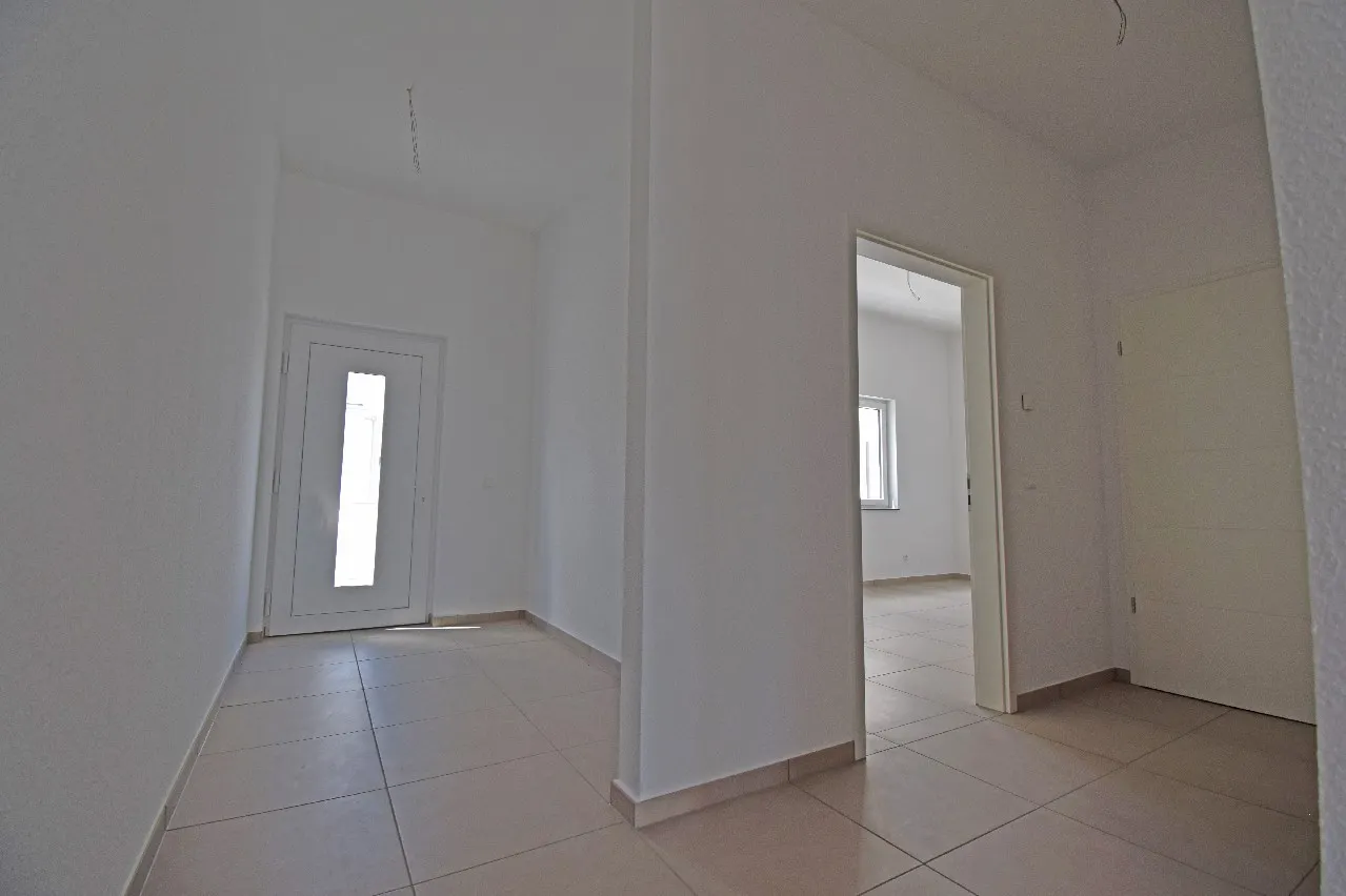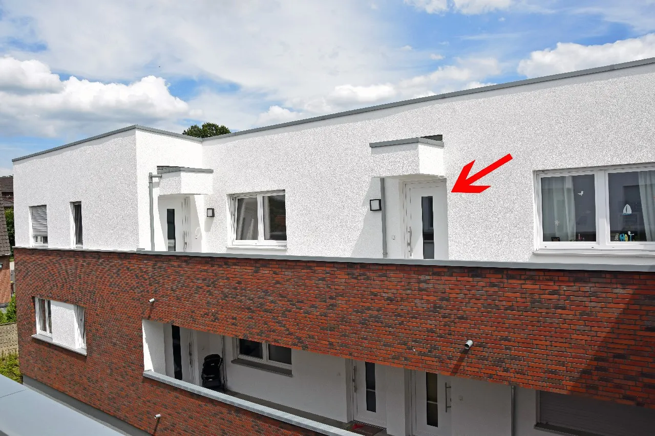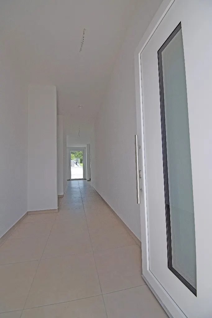 Über den vorhandenen Aufzug oder das Treppenhaus gelangt man zur entsprechenden Etage und von da aus, über einen Laubengang, zur Wohnungseingangstür. Diese ist in Kunststoffausführung, weiß, mit einem Glaseinsatz.