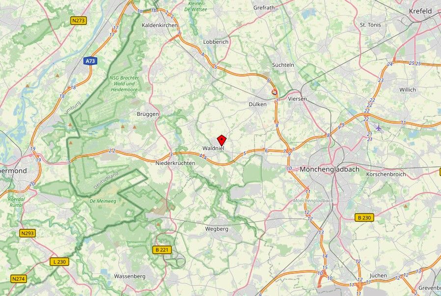 41366 Schwalmtal-Waldniel. Das Objekt befindet sich in einer ruhigen, ländlich geprägten Wohnlage. Die Straße ist eine wenig befahrene, verkehrsberuhigte Anliegerstraße mit überwiegender Wohnbebauung. Wander- und Radwege in der Nähe laden zu Freizeitaktivitäten im Grünen ein. Trotz der ruhigen Lage ist die verkehrliche Anbindung sehr gut. Über die nahegelegene A52 erreicht man das Düsseldorfer Stadtzentrum in rund 30 Minuten. Auch die A61 liegt in kurzer Entfernung und bietet eine schnelle Verbindung in Richtung Mönchengladbach, Roermond und Koblenz. Der Flughafen Düsseldorf ist mit dem Auto ebenfalls in etwa 30 bis 40 Minuten erreichbar. Der öffentliche Nahverkehr ist durch Busverbindungen in Richtung Viersen, Mönchengladbach und Niederkrüchten gewährleistet. Der nächstgele-gene Bahnhof befindet sich in Viersen oder Mönchengladbach mit Anschluss an den Regional- und Fernverkehr. Im nahegelegenen Ortskern finden sich Einkaufsmöglichkeiten, Apotheken, Ärzte, Banken sowie Kindergärten und Schulen. Auch gastronomische Angebote und Freizeitmöglichkeiten sind vorhanden.