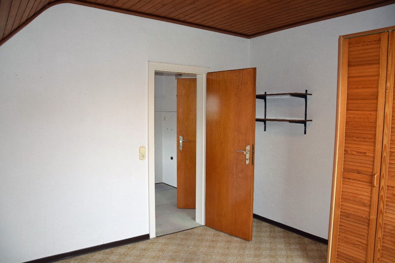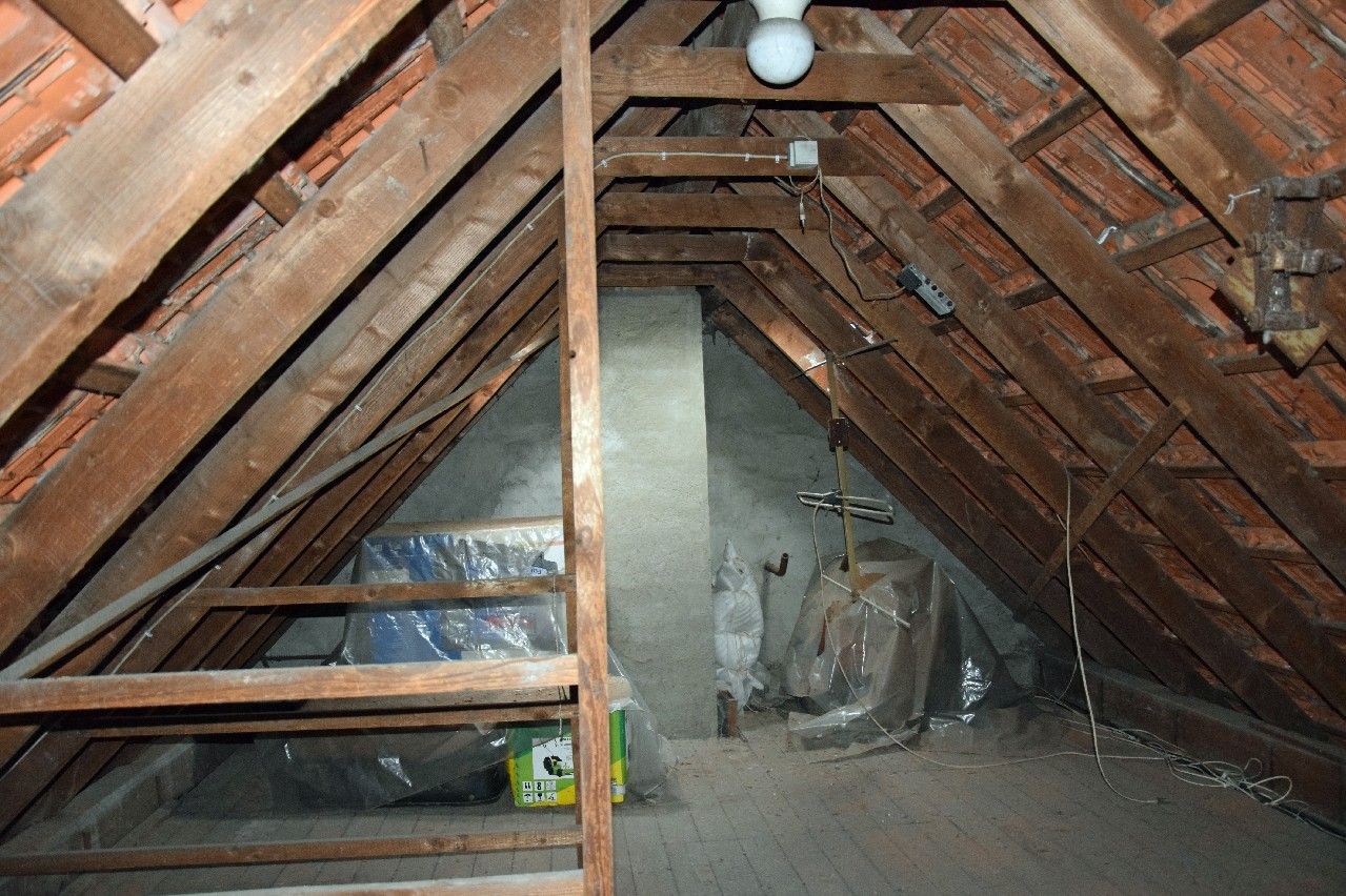 Eine Holzeinschubtreppe führt vom Flur aus auf den Speicher. Dieser dient als weitere Abstellfläche.