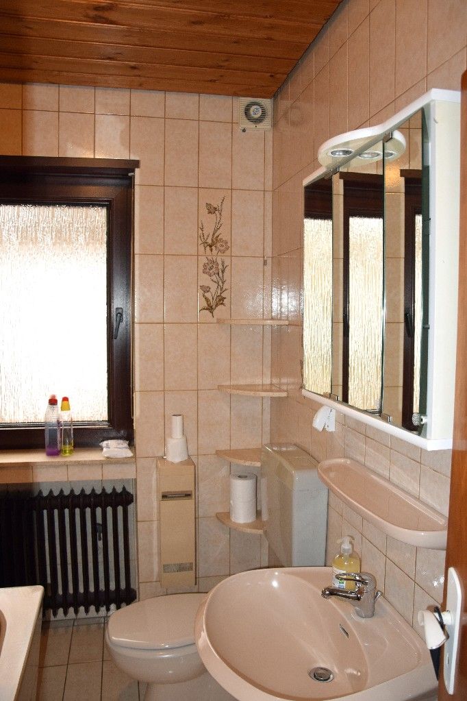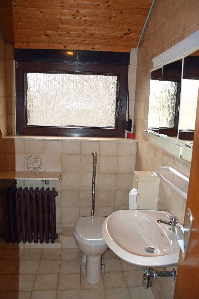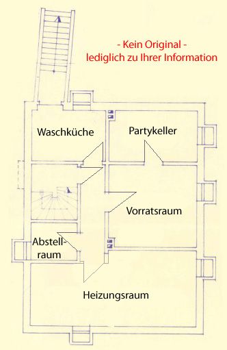 Im Keller befinden sich neben dem Flur ein Vorratsraum, ein Abstellraum, ein ehemaliger Partykeller, eine Waschküche und ein Heizungsraum mit Öltank. Eine überdachte Kelleraußentreppe führt von der Waschküche in den Garten bzw. auf den Freisitz. Altersfeuchtigkeit ist gegeben.