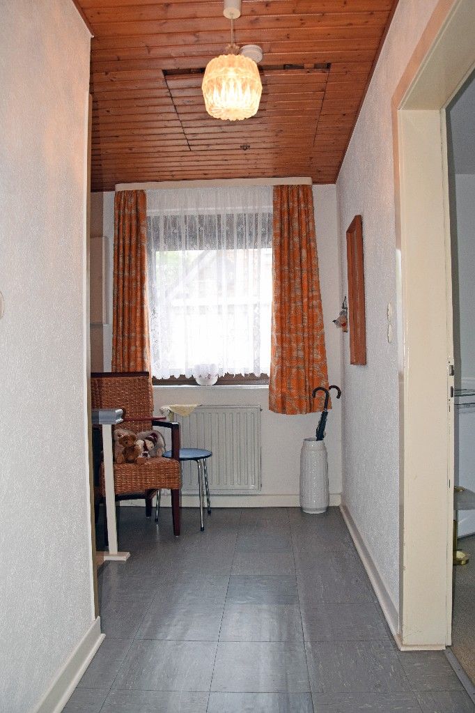 Von der Diele aus führt die mit Linoleum versehene Geschosstreppe in Holzausführung ins